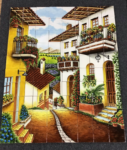 This charming rural Mexican street scene features whitewashed buildings, flowing bouganvilla flowers, flower boxes and while tile roofs with a mountain peak in the background. This is a gorgeous large mural of eighty (80) hand-painted 4"x4" tiles. Mexican Tile Designs has compiled a wide selection of beautiful hand-crafted Mexican Tile murals. Our murals come from several different artists and are painted in a diversity of styles from rustic to modern. Each is hand-painted by an expert craftsman/woman in Mexico and range in topic from flower baskets to underwater scenes to countryside vistas. You can find a striking mural to match any taste or decor style. Our hand-painted ceramic and talavera murals are perfect for kitchen backsplashes and walls, shower walls, tub surrounds, fountains, outdoor kitchens, patio walls and many other applications. A mural draws the eye and conveys a mood and ambiance like nothing else. These colorful Mexican tile murals portray beautiful fish and coral, flowers and vegetables, and country scenes in Mexico, Spain and Italy. If you have any questions about how to incorporate a ceramic or talavera tile mural into your decorating or remodeling project, please don't hesitate to call us. We are always happy to help!